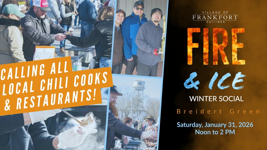Calling All Chili Contestants! The Village of Frankfort is looking for local restaurants and amateur chili cooks to compete in the Fire & Ice Winter Social Chili Cook-Off on Saturday, January 31, 2026, from 12:00–2:00 p.m. at Breidert Green! This is your chance to show off your signature chili, serve samples to the community, and compete for top honors and prizes. Contestants will enter one of two divisions: *Restaurant Division – Open to local restaurants, bars, and professional food establishments *Amateur Division – Open to non-professional chili cooks (the popular amateur competition is BACK!) Event attendees will sample your chili and vote for their favorites, making this a fun, high-energy competition and a great way to spotlight your culinary skills. “This event is a great way to bring our community together during the winter months,” said Mayor Keith Ogle. “We’re especially excited to bring back the amateur competition, which has always been a favorite.” Participation is FREE, but space is limited Registration deadline: January 17, 2026 Think your chili can take the heat? Sign up today and compete in Frankfort’s Fire & Ice Chili Cook-Off! https://frankfort.rja.revize.com/forms/13165